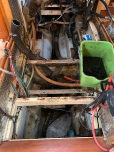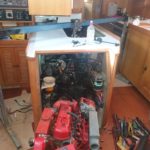 It now looks amazing. Surfaces that were black are now whiteish. We were able to lift a platform the genset sat on and another shelf that provides access to one of the bulge pumps. We bought both of them home. Martin made a new platform for the genset and painted the shelf.