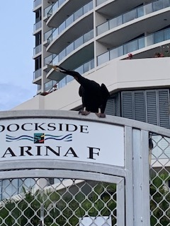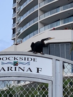 This morning I was taking all three animals (the two dogs and the cat) up for their comfort stop. It was a full moon and there were several prawn shells on the finger, and then a fully peeled prawn on the gangway. Now that is way too high for a prawn to jump. Above the gate, on guard, full wings spread was a shag making a racket. An interesting bird that swims under water, has the most amazing long neck that can swivel and rotate its head any which way.