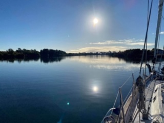 Armed with our coffees we re-traced our movements back to Saboteur. We climbed on board and gave Martin his coffee and sat to chat. The boat was in a gentle rolling pattern, so small that I almost don’t notice it anymore. This pattern gets the occasional disrupt with each passing boat. There were not many of these today. It was remarkably quiet for a public holiday that was heading for beautiful 27 degrees C. Not bad for winter. I am embracing the weather.